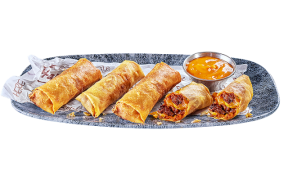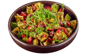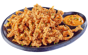Хрупкав пилешки стрипс с авокадо върху салата Романа с домашно приготвен азиатски сос Цезар, пармезан, микс сусам, крутони, зехтин, сол Малдон и тогараши.